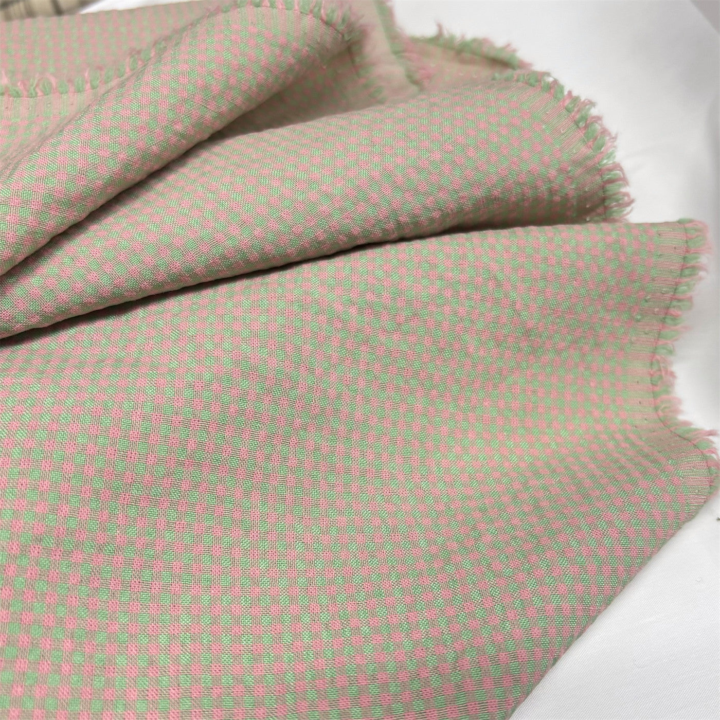 French Fashion Designer Gingham Green Non-Stretch Salt Shrinking / Puckered Linen Cotton Blended Seersucker DS06551